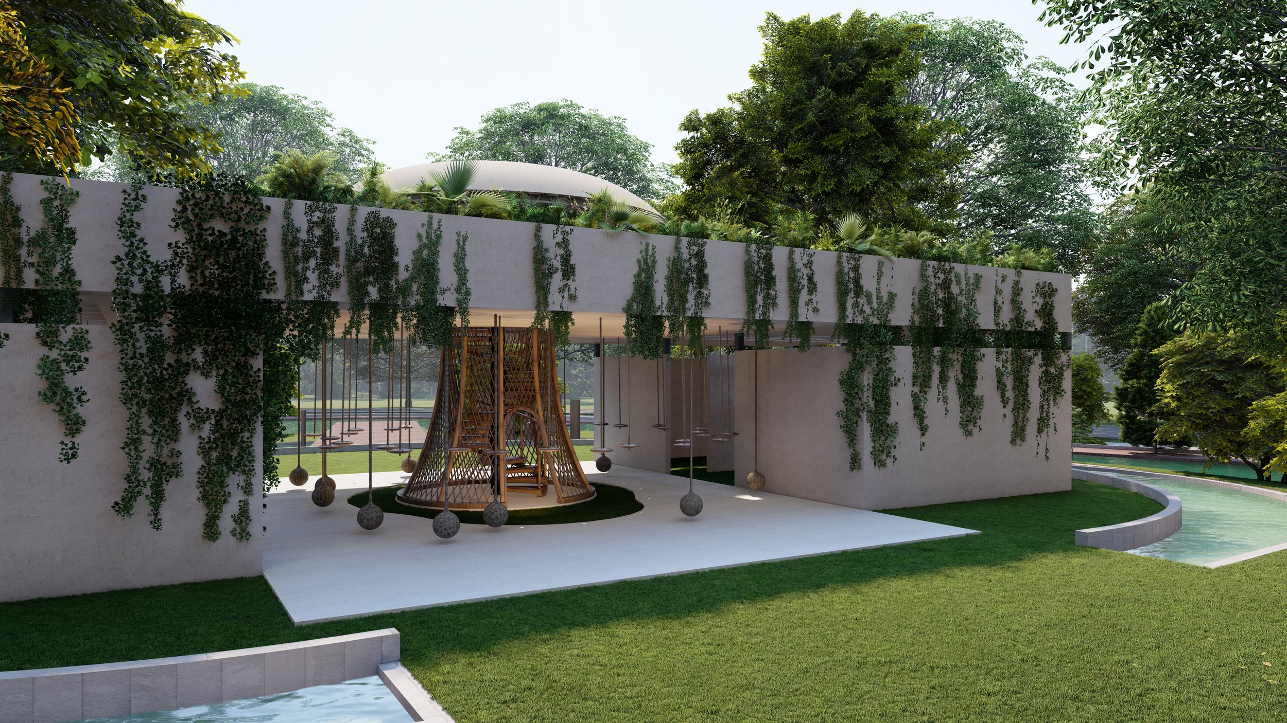 De manera complementaria, los juegos infantiles desarrollados en bambú introducen una dimensión lúdica y orgánica al conjunto, promoviendo la interacción, el movimiento y el contacto con materiales naturales desde edades tempranas. Su diseño busca integrarse al paisaje inmediato, generando espacios que invitan a la exploración dentro de un entorno controlado.