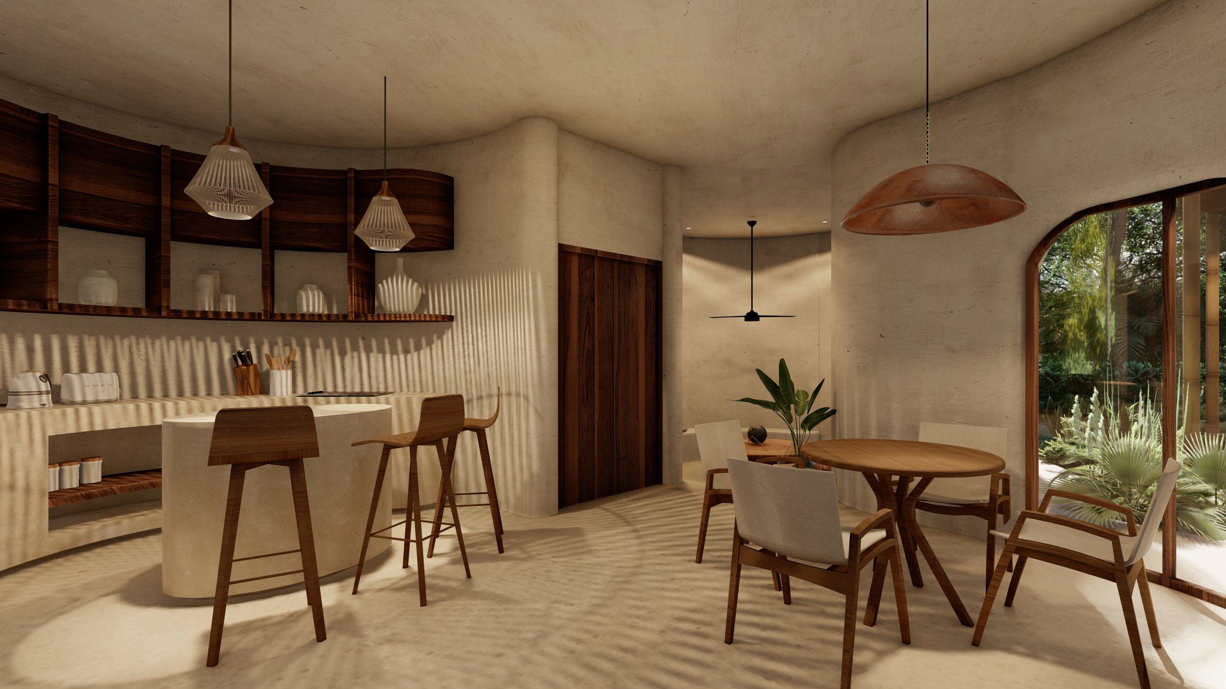 Un elemento fundamental del proyecto es su sistema constructivo: el uso de superadobe. Esta técnica, basada en sacos de tierra compactada, permite generar estructuras monolíticas, térmicamente eficientes y de gran inercia, ideales para el clima cálido-húmedo de la región. Además de su bajo impacto ambiental, el superadobe posibilita la creación de las formas orgánicas que definen la identidad espacial de la vivienda, reforzando su integración con el entorno natural.