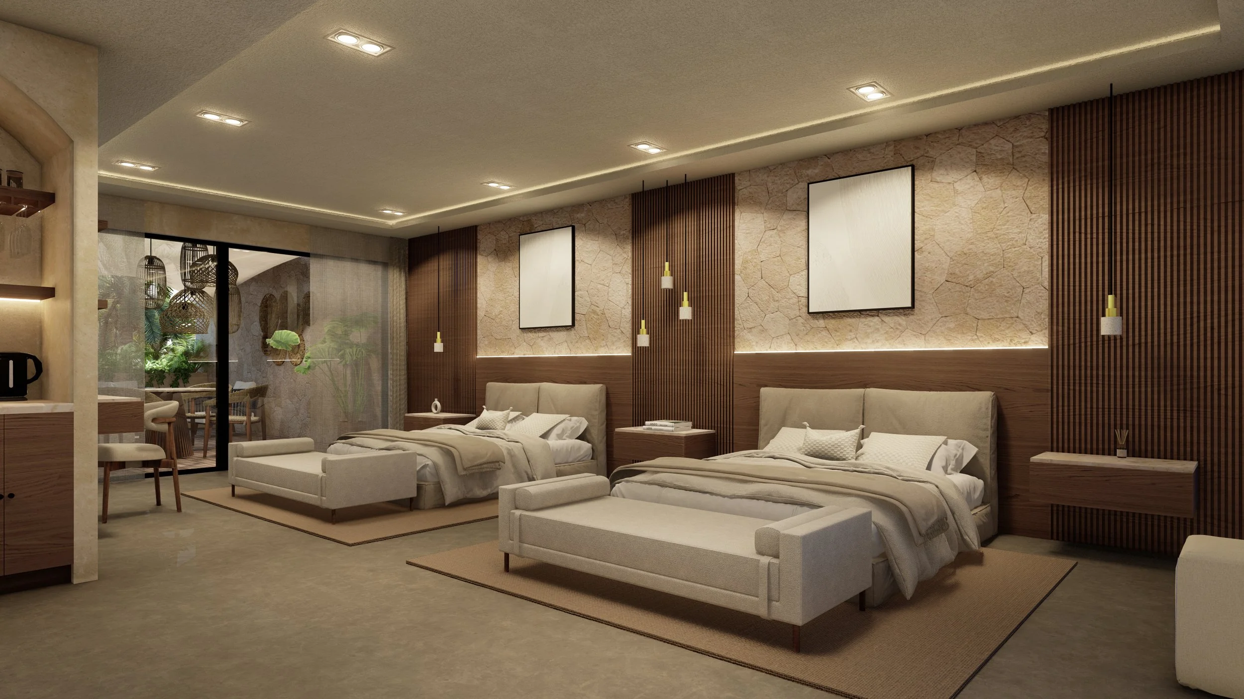 Las habitaciones de Ana y José Holbox están concebidas como espacios de calma y apertura, donde la arquitectura interior prioriza la conexión con el exterior y el confort sensorial. A través de una paleta de materiales naturales, tonos neutros y texturas cálidas, cada espacio construye una atmósfera serena que invita al descanso y a la contemplación.